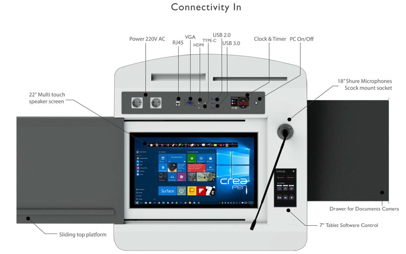 Çok amaçlı komple konektör panelleri güce, harici projektöre ve ekran cihazlarına erişim olanağı sağlar, Hoparlörler cihaz seslerini toplantı salonlarına ve konferans salonlarına iletir. Her türlü ses ve görüntü cihazını barındıracak kadar geniş bir gövdeye sahiptir. ML22T PRO entegre bir bilgisayar ile donatılmıştır, ekstra bilgisayara ve donanıma ihtiyaç duymadan kürsü üzerinden sunumlar gerçekleştirebilirsiniz.