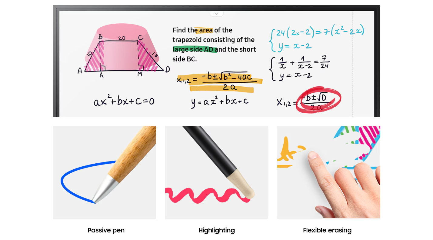 Etkileşimler, problem çözme ve yaratma için sezgisel olarak tasarlanmıştır. Fikirlerinizi hayata geçirmek için yanınızdaki herhangi bir nesneyi kullanabilirsiniz. Flip 3, ince veya kalın nesnelerden gelen girdileri ayırt ederek ekranda yazı yazma ya da vurgulama deneyimini simüle eder. Ya da yalnızca parmağınızla veya avucunuzla kolayca silebilirsiniz.