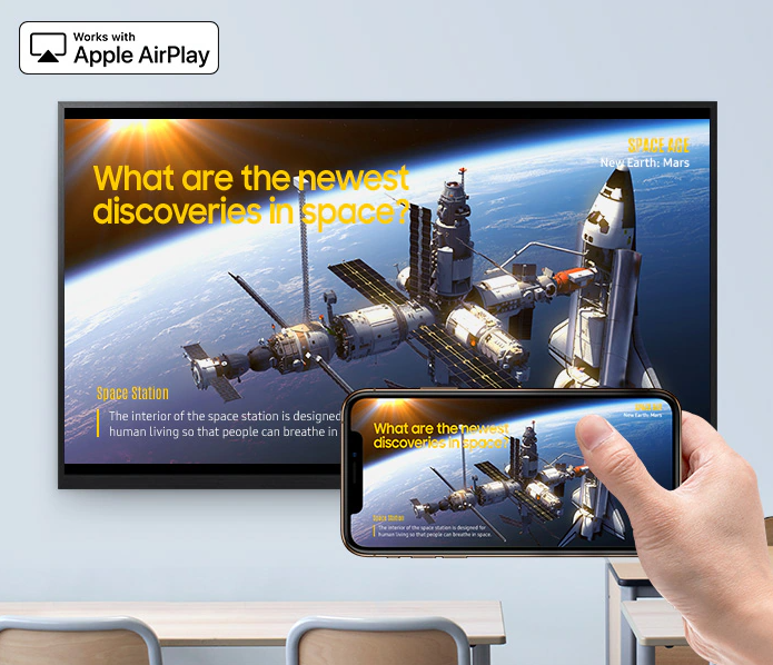 AirPlay 2 dahili olarak sunulduğu için öğretmenlerin ders planlarına video eklemesi her zamankinden daha kolay. Kablosuz ve kesintisiz kurulum ile eğitimciler, kişisel Apple cihazlarından videoları sınıftaki Flip 3’e aktararak ders süresini en verimli şekilde kullanabilir.
