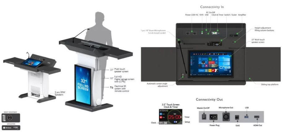 TK32H’ın gövde üzerinde bulunan lift sistemi sayesinde konuşmacının boyuna göre yükseklik ayarı yapılabilmektedir. Dokunmatik ekranın açısını ayarlayarak ideal görüntüyü yakalayabilirsiniz. Ekranı kullanmadığınız zamanlarda kayar kapağı kilitleyerek güvenli bir şekilde muhafaza sağlayabilirsiniz.